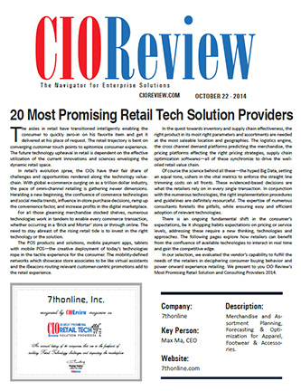 时至今日,第七在线已拥有一流的技术产品和丰富的行业经验,其针对零售企业和时尚品牌打造了整套的商品计划和优化管理平台, 公司多次被美国知名技术研究和咨询公司评为 “行业领军企 业”, 上 榜美国《CIO Review》杂志“最富潜力零售科技公司20强”, 与 Oracle等上市公司在行业内共享领导地位
